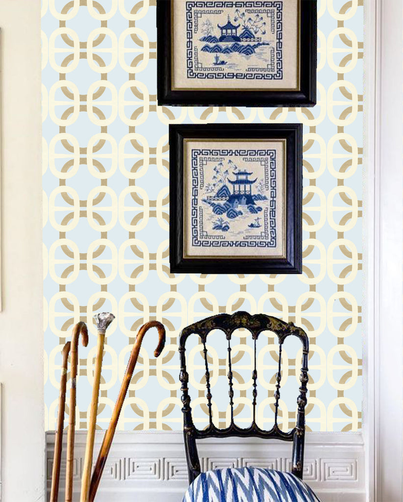 Jeanne Luc Light Blue Wallpaper | Catchii Netherlands Europe Vintage design with abstract hand painted geometric patterns that evoke a 70s atmosphere. Nostalgic vibes to create warmth and joy in your home.