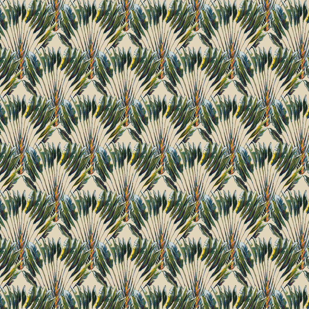 Madagascar Green Wallpaer | Catchii Netherlands Europe Celebrating our exotic and refined nature. The hand-painted palm pattern is inspired by the palm of Madagascar. It is called “traveler’s palm” because its leaves collect rainwater that flows into the stems of the plant, ready to help a thirsty traveler. The fan-shaped pattern is like a peacock’s tail. This luxurious wallpaper is an invitation to travel.