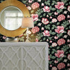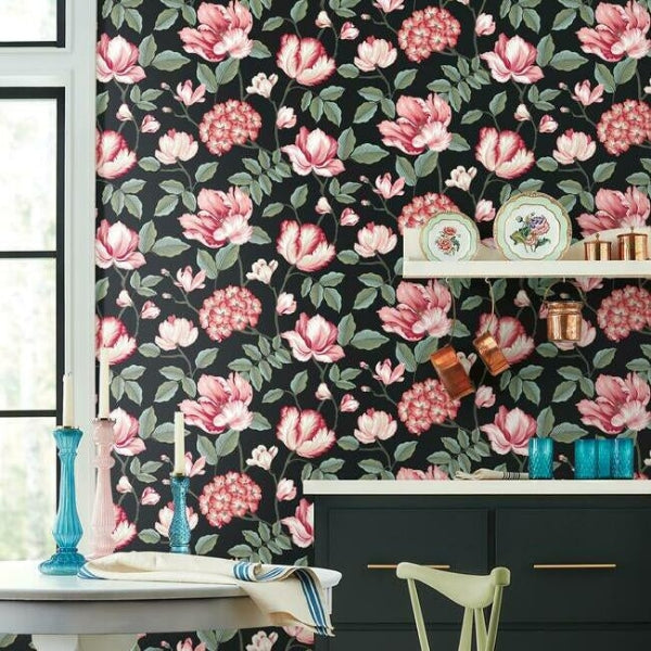 Hydrangeas and tulips flower among branches and spring leaves in pattern Morning Garden. This Morning Garden Wallpaper measures approximately 27 inches wide by 27 feet long, covering About 60.