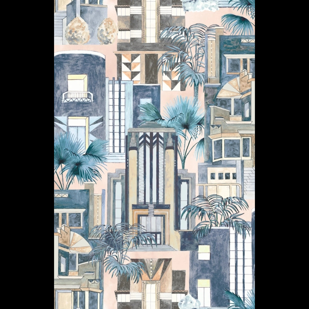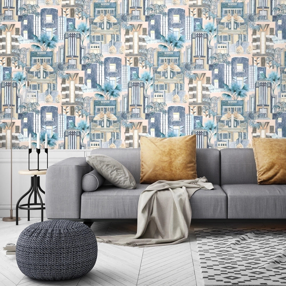 Class A Fire RatedA whimsical cityscape comes to life in soft hues on the Downtown Deco Pastel Blue Wallpaper by Brand McKenzie. #homedecor #luxurywallpaper #artfulinteriors