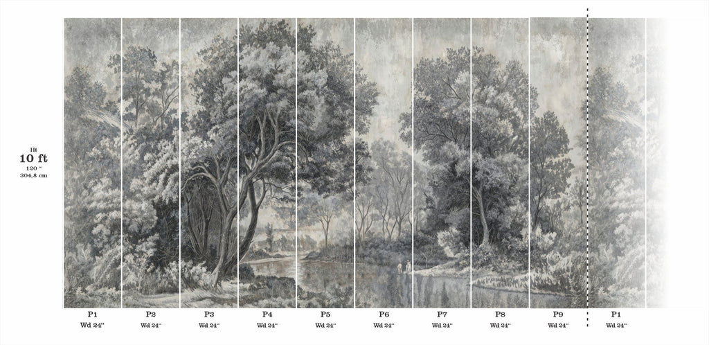 A refined panoramic mural inspired by early 19th-century French wallpapers in grisaille technique, reminiscent of Zuber and DufourÕs scenic compositions. ÒBois TranquilleÓ portrays a peaceful forest by a calm river, rendered entirely in subtle greys to evoke timeless elegance. This mural brings the charm of classic French interiors to any sophisticated space.