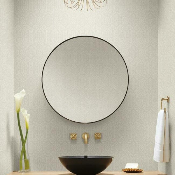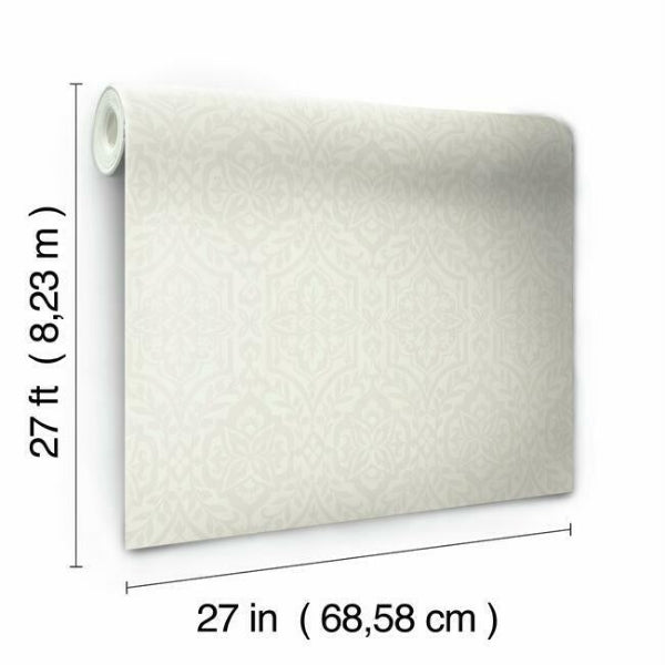 Ornate, raised filigree pattern Cathedral Damask is inspired by the beauty of stained-glass windows. This Catherdral Damask Wallpaper measures approximately 27 inches wide by 27 feet long, covering About 60.