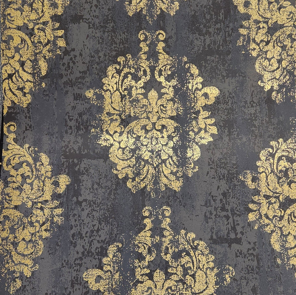 Luxurious gold damask patterns elegantly contrast against a sleek black marble background, creating a timeless and sophisticated wallcovering. Perfect for adding drama and refinement to any space. #luxurywalls #damaskdesign #sophisticatedinteriors