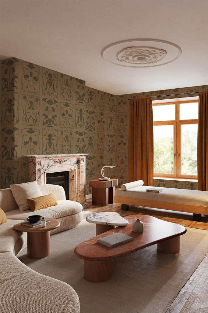 With its refined symmetry and stylized botanical lines, this wall mural reimagines classic Art Nouveau with a minimalist soul. The olive greens introduce a sense of calm and grounded elegance, while the linear floral forms add a graphic yet organic layer. Ideal for those who appreciate restrained design with subtle historic references, this mural enriches the room with a timeless rhythm and soft structure.
