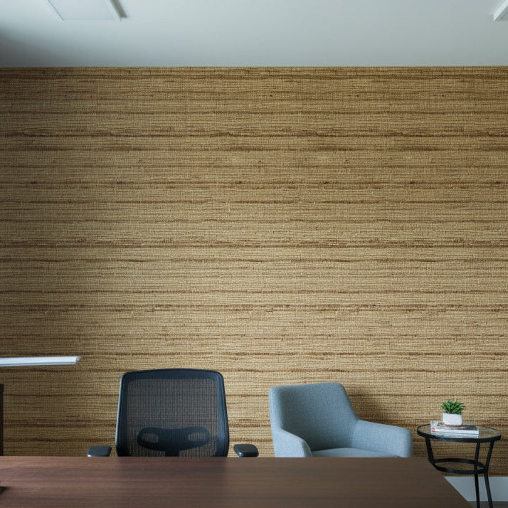 This natural woven wallcovering brings organic texture and warmth to any space. The horizontal wood-like striations and vertical thread-like pattern create a sophisticated, yet rustic aesthetic.