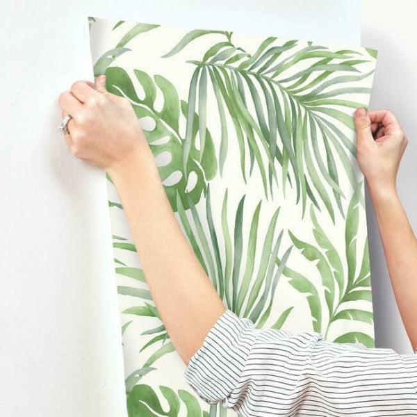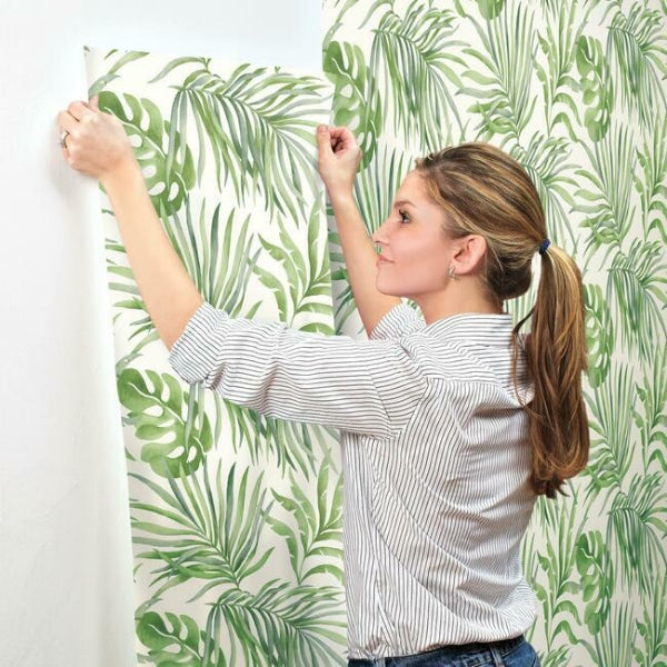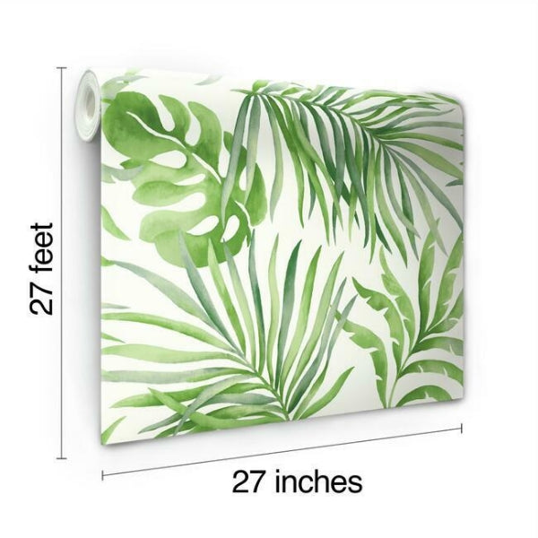 The languorous mood of the tropics comes alive with Paradise Palm Wallpaper featuring life-size leaves that seem to rustle in the breeze pleasantly cooling the noon day sun. This Paradise Palm Wallpaper measures approximately 27 inches wide by 27 feet long, covering About 60.
