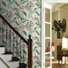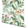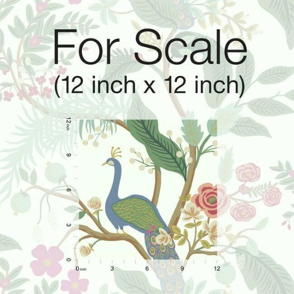 In this modern take on traditional chinoiserie motifs by Rifle Paper Co. , magnificent peacocks perch on winding branches, surrounded by bright blooming flowers and emerald leaves.
