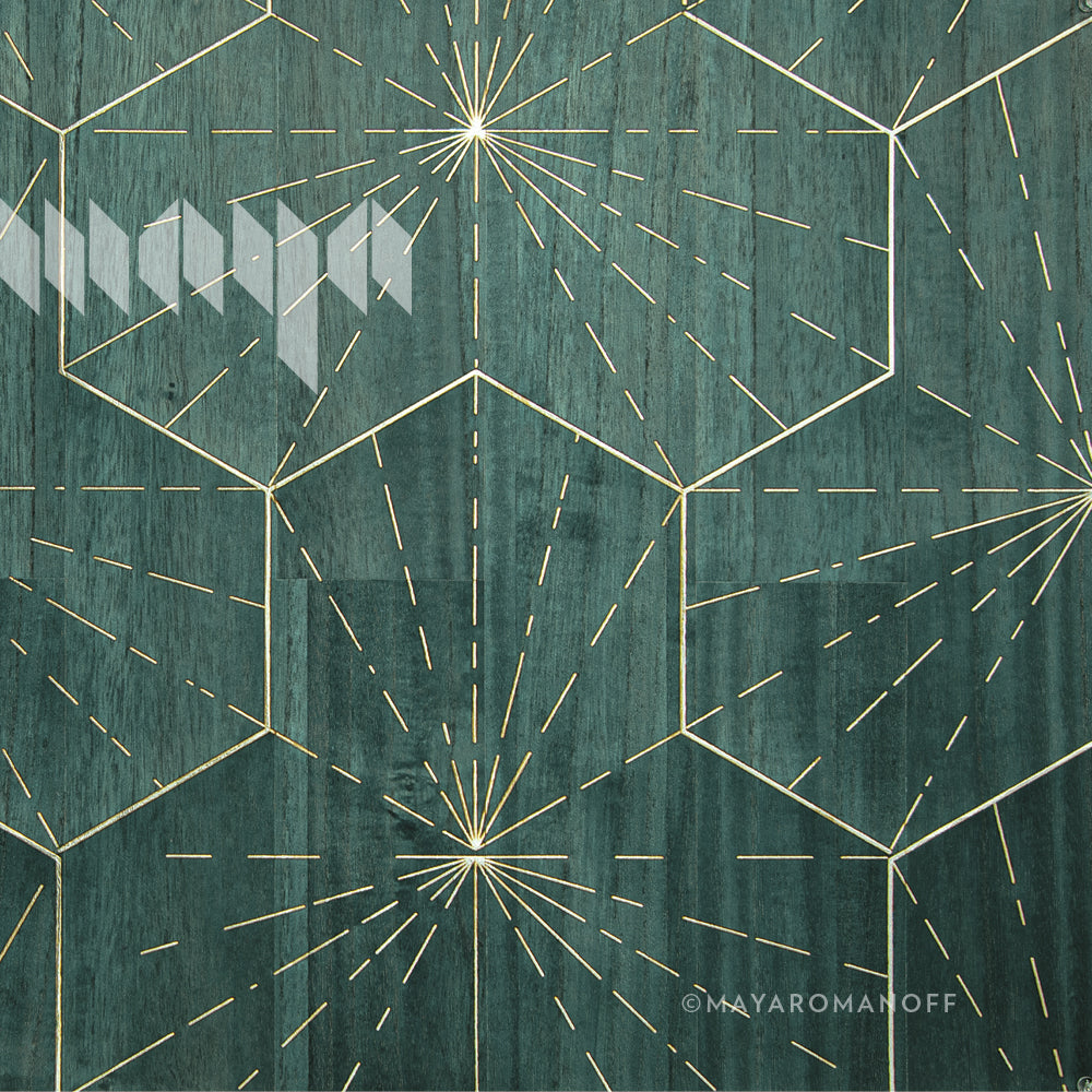 In collaboration with design firm Jeffrey Beers International, Ajiro Burst of Happiness evokes a feeling of euphoria—an emotive and sophisticated wallcovering for any environment. Hand-inlaid paulownia wood veneer is laser-cut to reveal a beautiful, energized stream of metallic foil “bursting” throughout a classical hexagonal pattern. Available in 10 elated colorways.