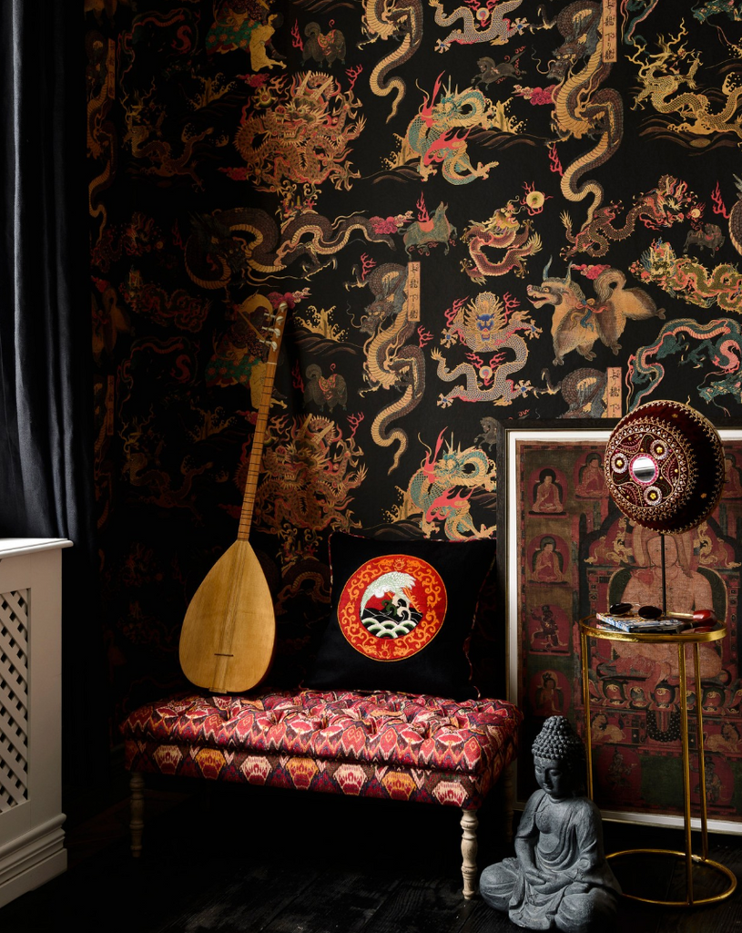 Majestic dragons swirl through rich, jewel-toned clouds in the vibrant Dragons Of Tibet Wallpaper by Mind the Gap. A bold statement. #luxurywalls #interiordecor #patternplay