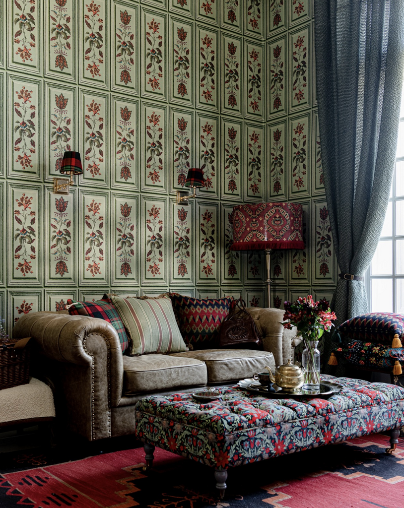 Rich alpine greens and folk-inspired panels define this striking Tyrolean Panel Alpen Green Wallpaper by Mind the Gap. #luxurywalls #interiorspace #designerstyle
