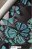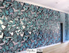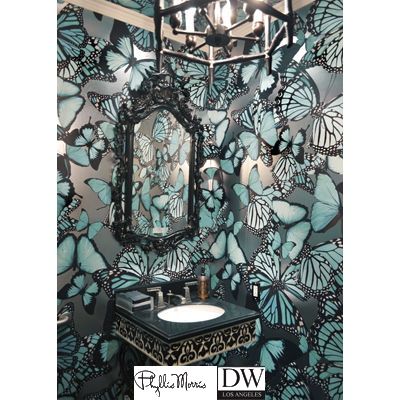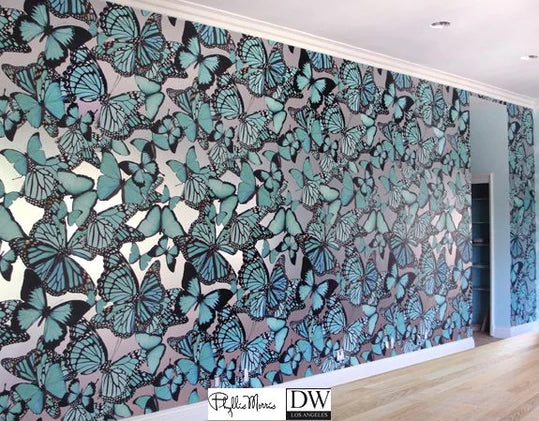 Graceful butterflies in vibrant shades of turquoise and soft blue flutter across this striking design by Phyllis Morris. #luxurywalls #butterflymotif #homedecorstyle