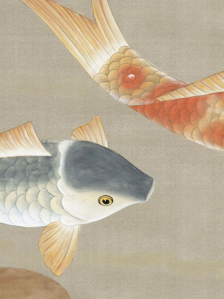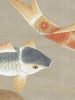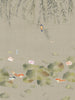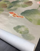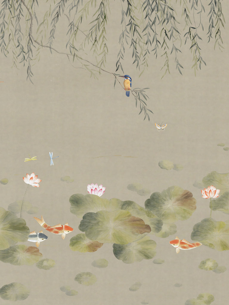 Alcedines are a pair of consecutive panels of a water side scene hand painted on a pearlized silk paper ground. Each panel measures 36" wide by 98" tall. The full mural is 6' wide by 8' tall.