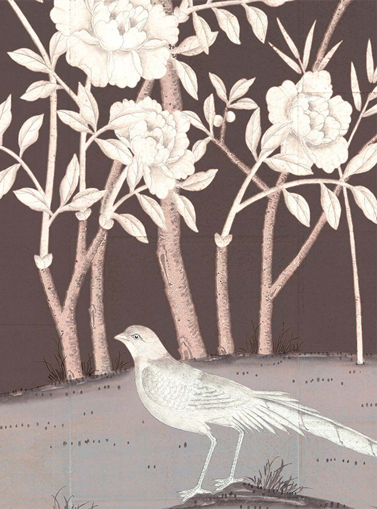 Birds of Flight is based on Mural Source chinoiserie classics. Consisting of monochromatic foliage and bold background colors, this classic subject matter is portrayed in a stunning modern fashion. 3 Panels Available in Full Length/Headers/Footers, Sold in individual Panels, Width: 30" 36", Design Height: 108", Total Height: 102", Birds of Flight,Paul Montgomery Studios