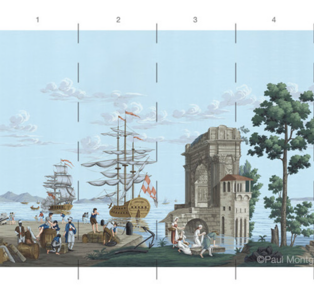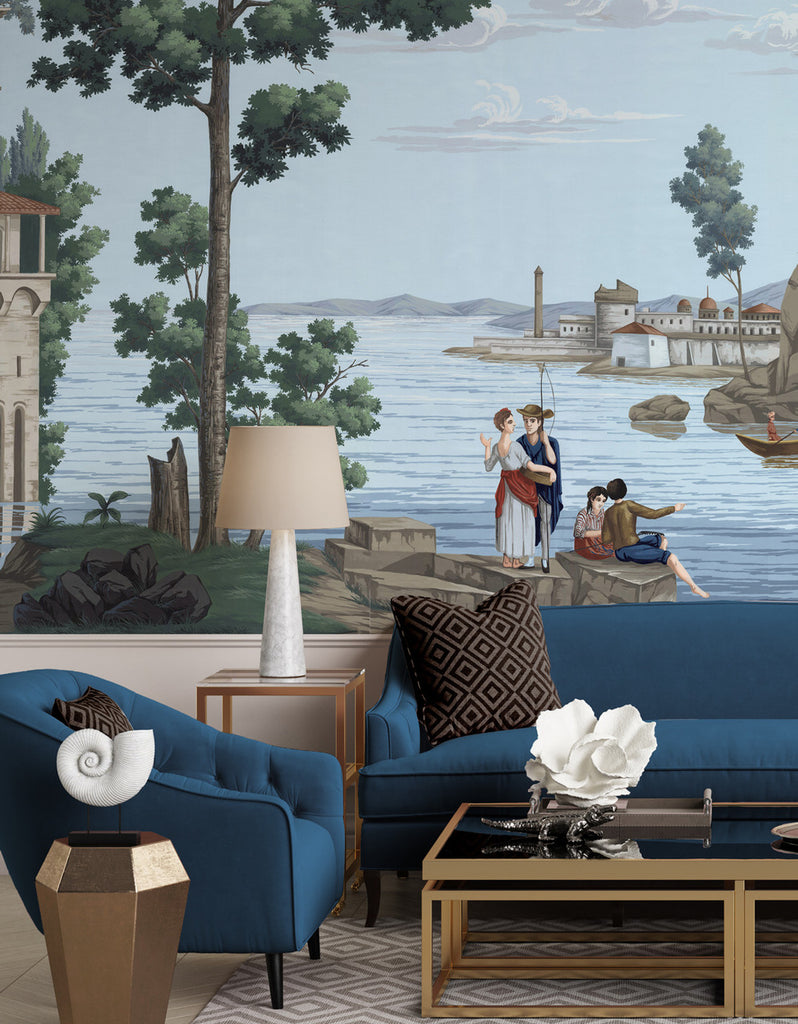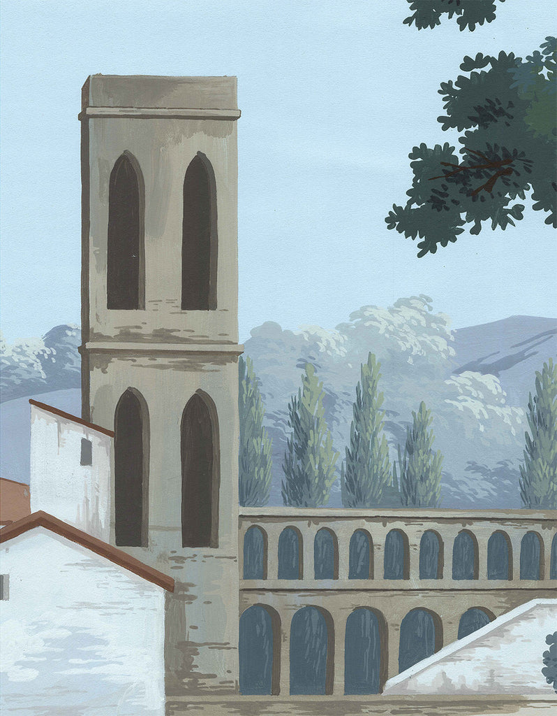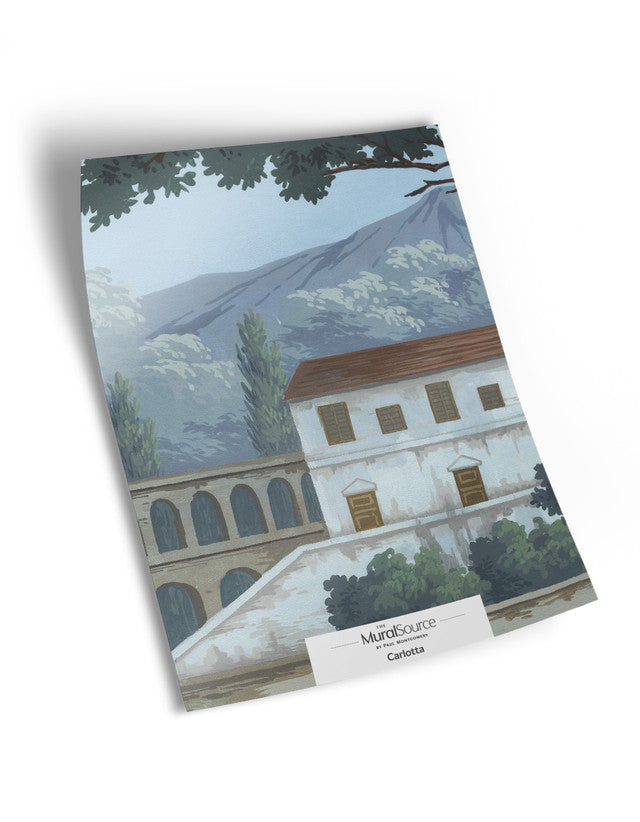 Carlotta is a panoramic landscape mural of idyllic Italian scenery. 8 Panels Available in Full Length/Headers/Footers, Sold in individual Panels, Width: 36", Design Height: 96", Total Height: 84", Carlotta,Paul Montgomery Studios