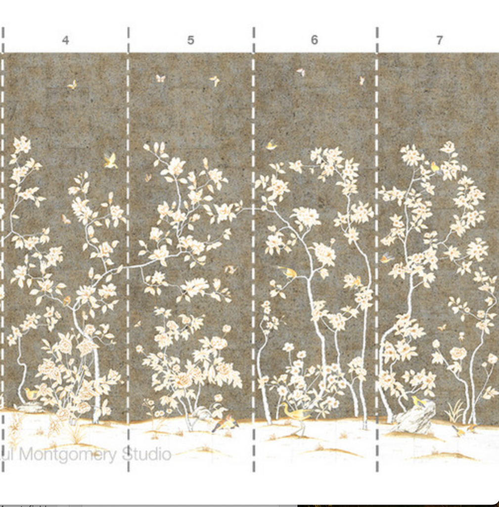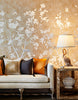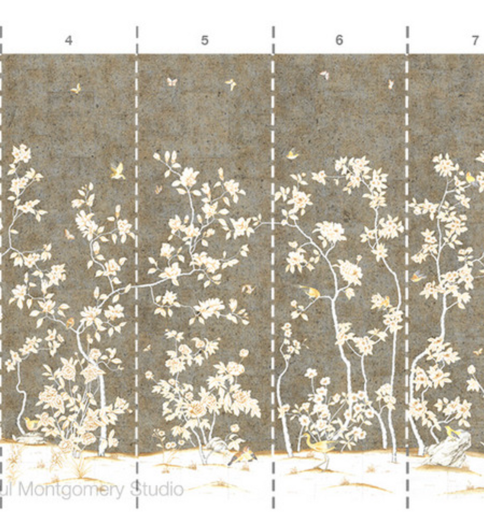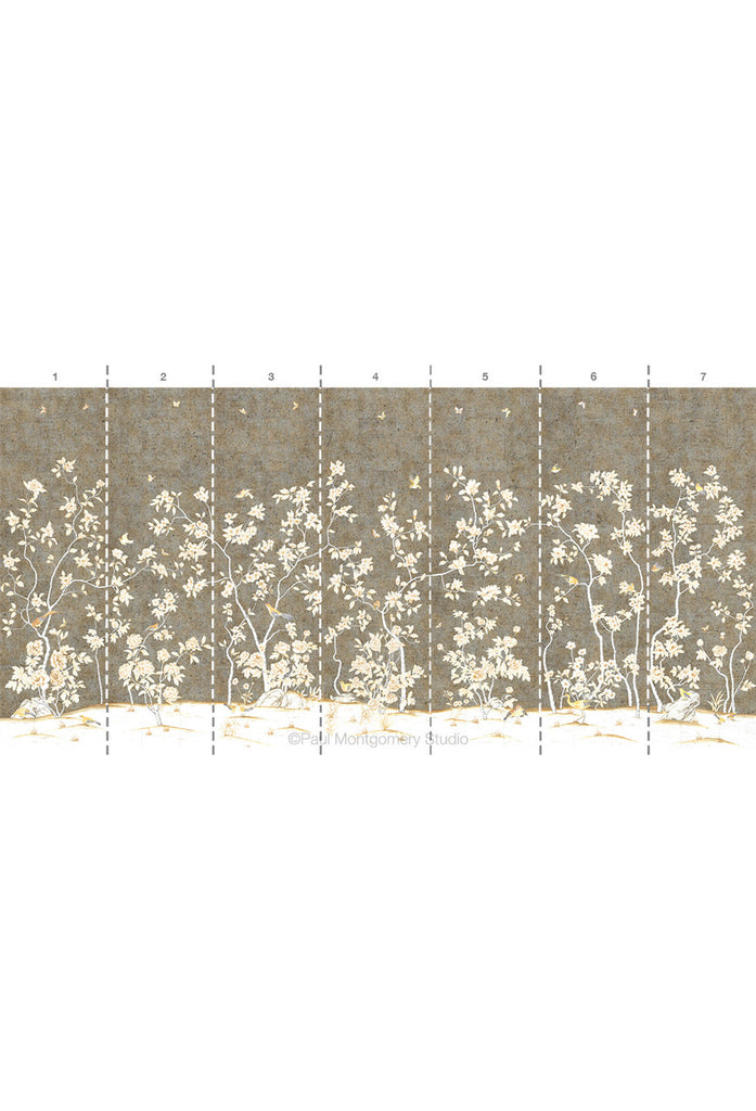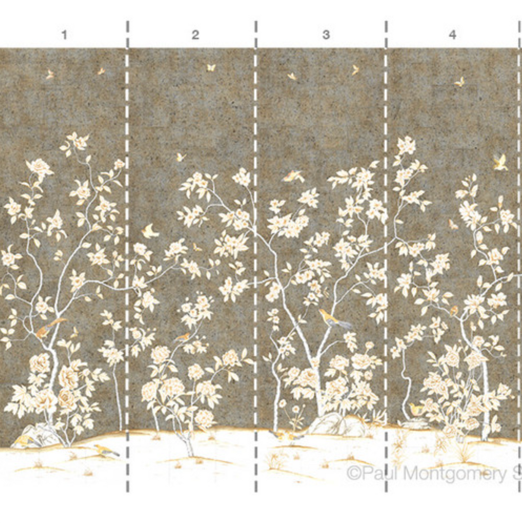Our Carolina Silver Speckle chinoiserie mural delights with white blooming trees and golden birds on a speckled metallic Type II Wallcovering. 7 Panels Available in Full Length/Headers/Footers, Sold in individual Panels, Width: 36", Design Height: 120", Total Height: 96", Carolina Silver Speckle,Paul Montgomery Studios
