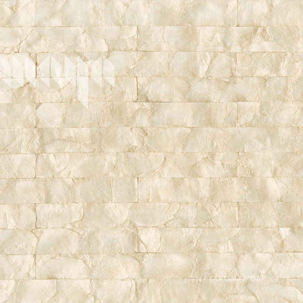 Genuine hand‑inlaid capiz shell tiles comprised of one‑inch strips. Mother of Pearl’s stain‑resistant finish is durable, cleanable and flexible. When pasted, tiles have the capability to turn corners and wrap columns. Install in running bond, horizontal or vertical.