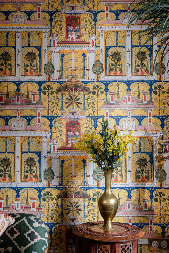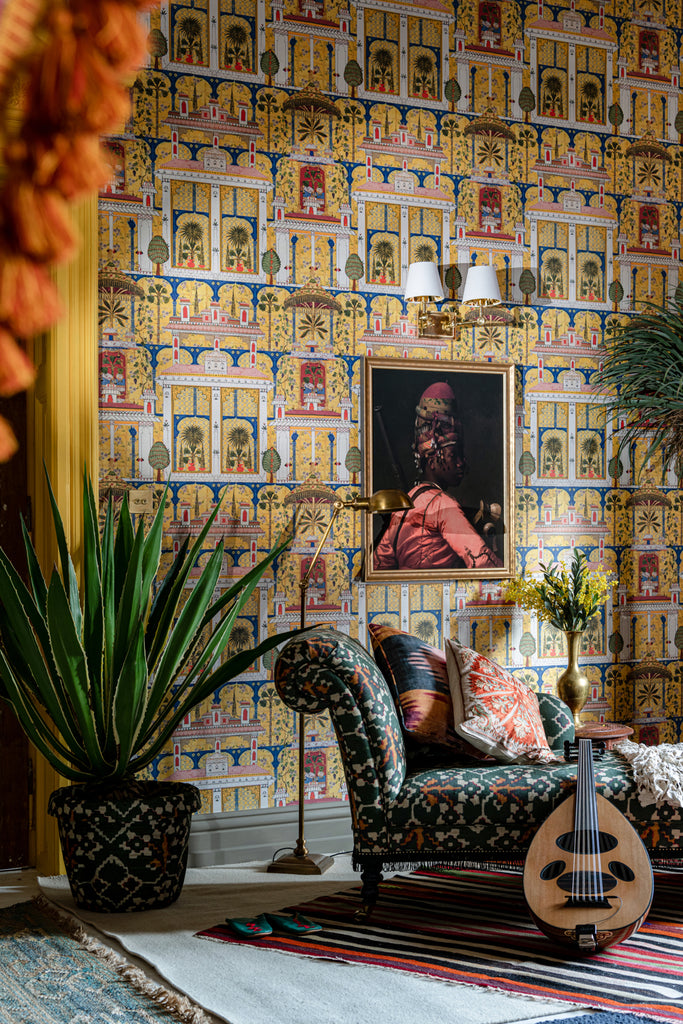 Set against a bold yellow backdrop, a sensory indulgence awaits as you immerse yourselfin ornate architecture decorated with statement foliage and bold colours while pastel pink roofs bring a calm contrast to the intricacy of the MARJORELLE GARDEN print. Delicate purple flowers cascade around the architectural columns as a central golden canopy offers an elegant shady retreat from the warm African sun. A bold and captivating print named after the celebrated garden in Marrakech, this wallpaper is perfect for a maximalist home. All Mind The Gap wallpapers are made on new generation non-woven substrate. Printed with eco-friendly inks, Mind The Gap wallpaper are easy to install on any wall type. When hanging the wallpaper, apply the ready-mix adhesive paste on the wall and hang the strips one by one by butting the edges together. The adhesive allows for a while moving the wallpaper strips, so that the wallpaper pattern continues correctly from one strip to another. All our wallpapers are tested and certified for fire rating according to the international legislation. More information and official reports regarding the fire rating are available on demand.
