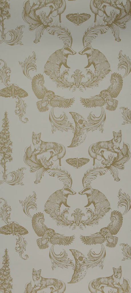 A beautiful wallpaper design by Laura Garner featuring charming hand drawn illustrations of whimsical woodland creatures including badgers, foxes and birds, all of which can be found nestled amidst forest foliage beneath a shimmering golden moon. Set upon a light cream background, this stylish and sophisticated wallpaper is a modern and contemporary twist on the traditional damask style which will look stunning in a rural retreat or city living space.