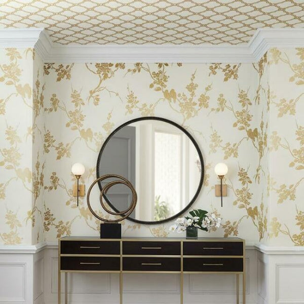 Iphigenie Metallic Gold,White Imperial Blossoms Branch Animals/Insects Gold Red Wallpaper | Jeffrey Stevens