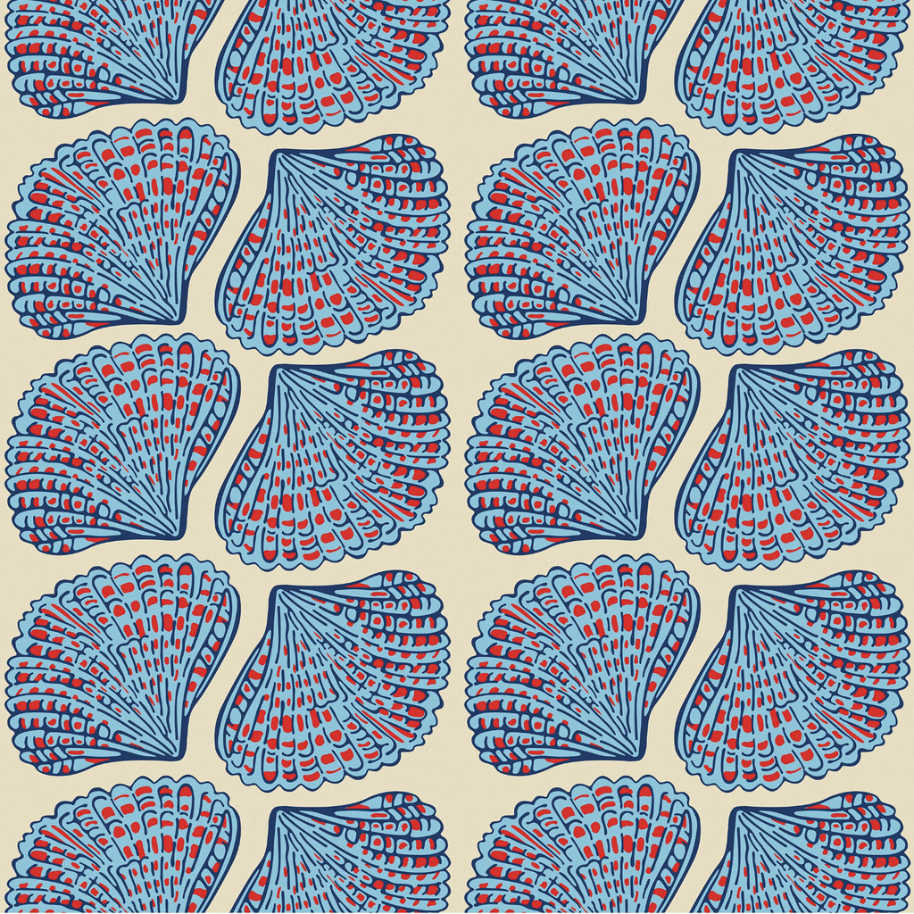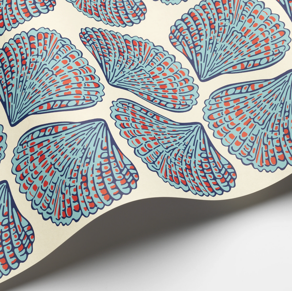 Elegant seashell motifs in rich blue, red, and cream bring a dynamic, coastal-inspired charm to any space. #luxurywalls #interiorstyle #artfuldecor