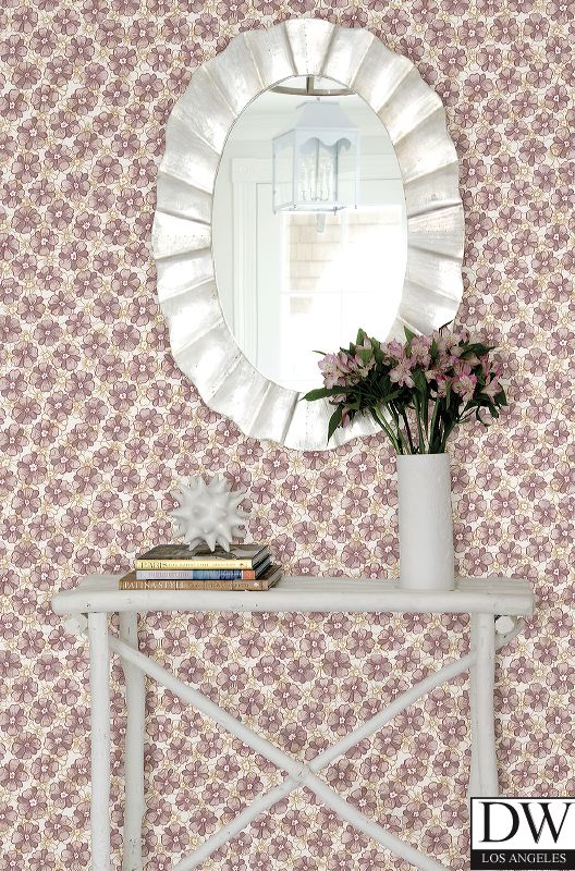 Plum and lavender watercolor flowers dot this floral wallpaper. Upon closer inspection, gold sketch overlays create a more subtle pattern, adding dimension to this beautiful design.