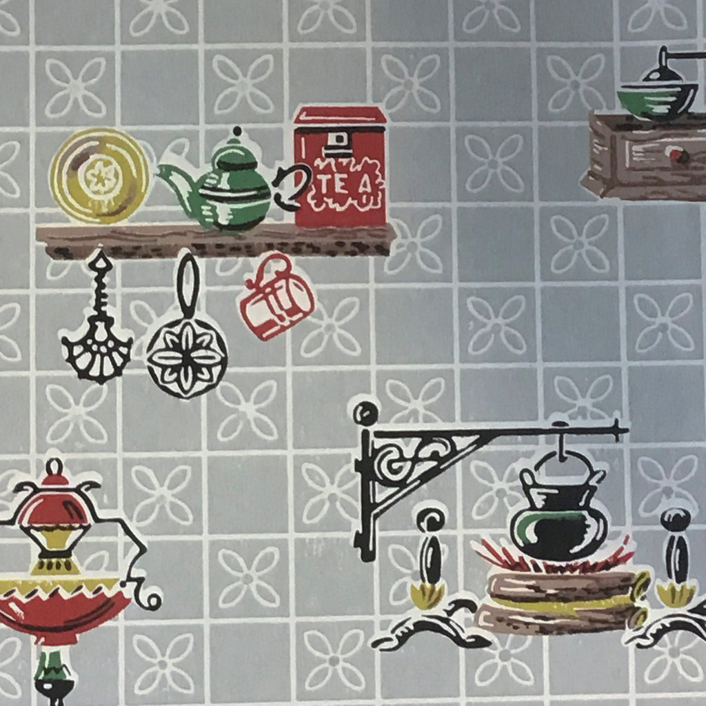 This authentic 1950's reproduction wallcovering features a charming kitchen motif, perfect for adding a touch of retro flair to commercial spaces. The light gray background and playful illustrations create a welcoming and nostalgic atmosphere.