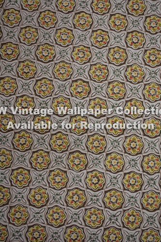 This authentic 1960's reproduction vintage wallcovering features a geometric floral pattern with a mid-century modern aesthetic. Its classic design and durable paper material make it suitable for various commercial applications, adding a touch of retro charm to any space.