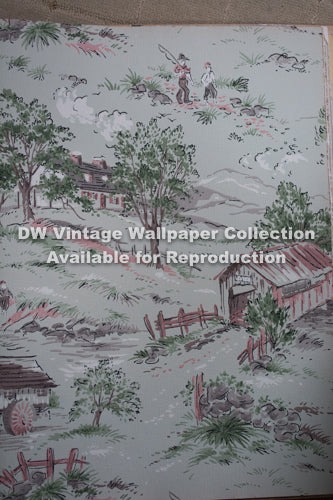 This vintage-inspired wallcovering features a charming scenic design, reminiscent of a bygone era. Its light blue background and detailed illustrations create a nostalgic and inviting atmosphere, perfect for adding a touch of classic elegance to any space.