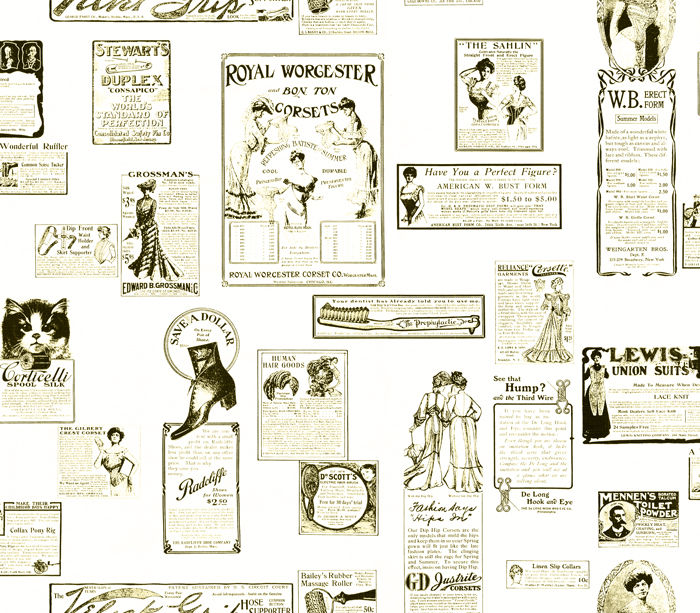 This wallcovering features a collage of vintage newspaper advertisements, creating a nostalgic and historical ambiance. Ideal for adding character to spaces seeking a touch of old-world charm, it works well in areas where a unique and conversation-starting design is desired.