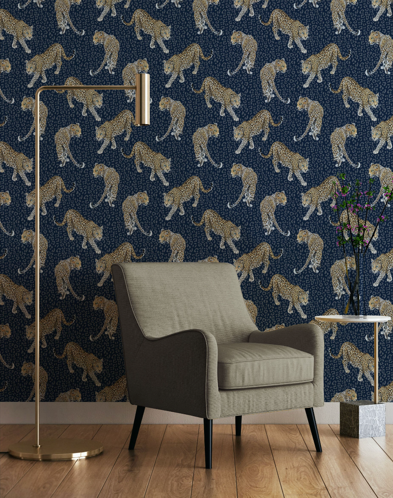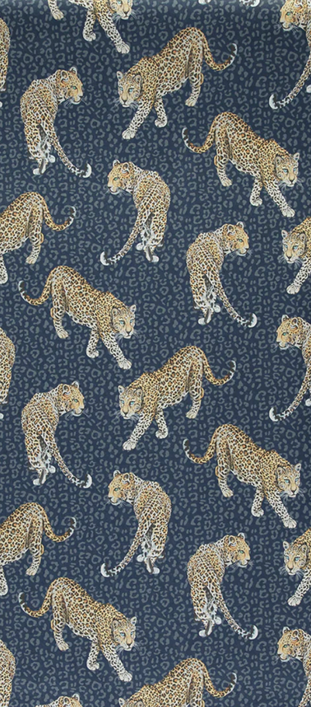 A simple yet striking wallpaper design from Abi Bartlett, featuring beautifully hand painted leopards prowling across a tonal leopard skin background in a deep blue colour way. This gorgeous wallpaper will add a̴ sense of glamour to any room.