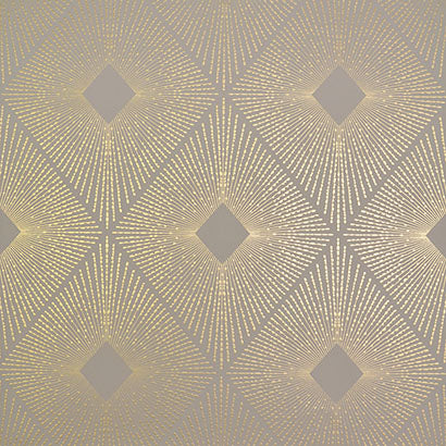 Precious metallic colors form geometrics, abstracts, and nature inspired patterns in Antonina Vella's Modern Metals wallpaper collection by Wallcoverings..Radiating beams of metal burst forth from a dismond shape, Antonina Vella Harlowe Wallpaper forms a shimmering aura against contrasting color.