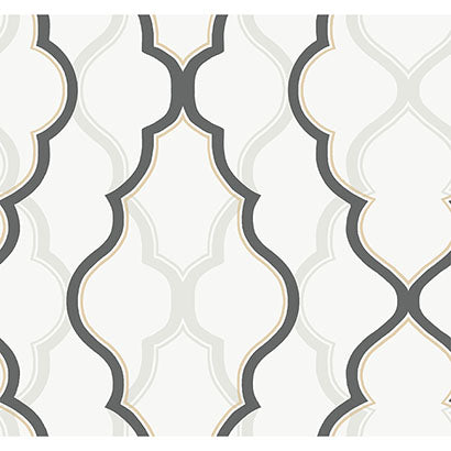Large scale and bold with arabesque designs and metallic tracery in the foreground; soft shadows repeat the design in the background. This is Double Diamond, a strikingcontemporary wallpaper.
