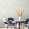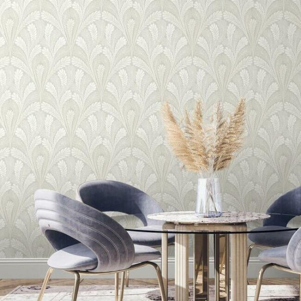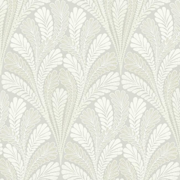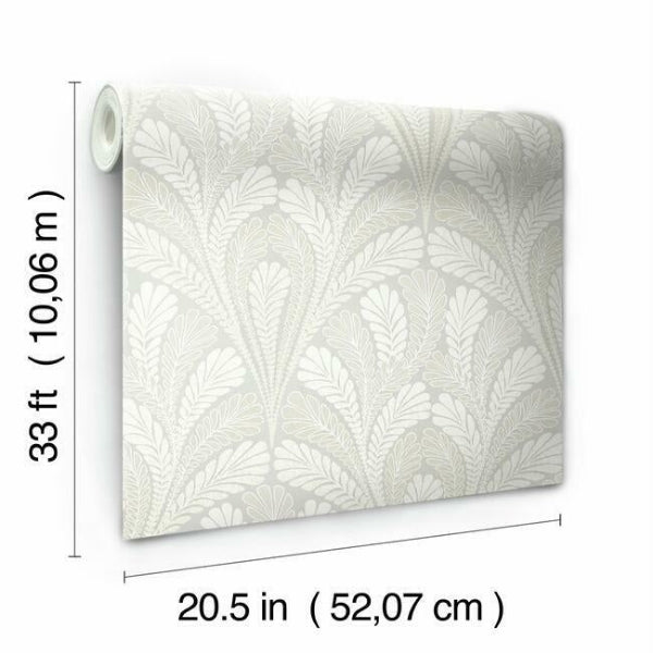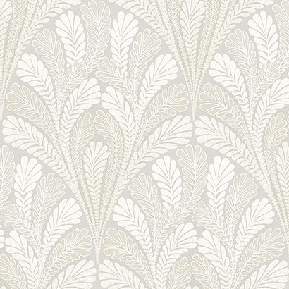 Fan shaped feathery pinnate leaves define the graceful arch of pattern Shell Damask, accented by the addition of modern metallic and pearlescence. This Shell Damask Wallpaper measures approximately 20.