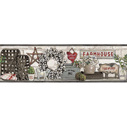 Vintage rural charm melds with smart urban styling for an approach to clean and green living as evidenced by the warm simplicity of Rustic Charm by Wallcoverings..Featuring knick-knacks and trinkets collected and displayed on a wooden ledge, Farmhouse Shelf Wallpaper Border adds a personal touch to evoke sweet memories of the past.