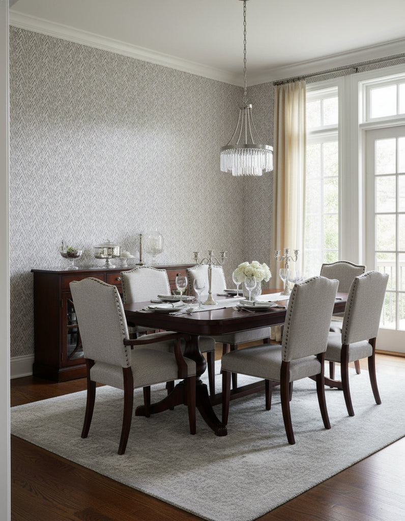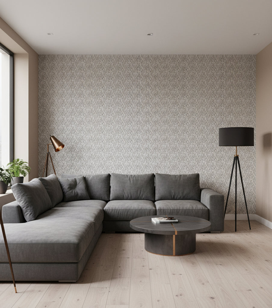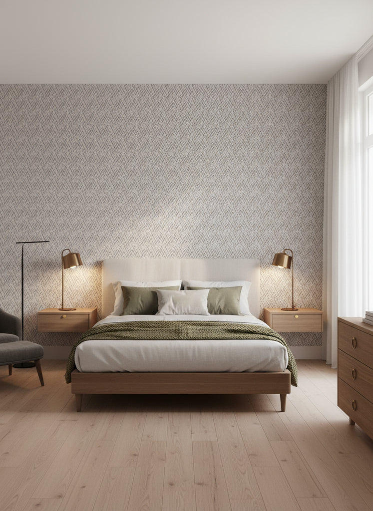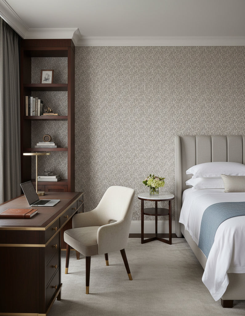 This Shibori Chevron vinyl wallcovering offers a tactile, textured feel with a modern geometric pattern, ideal for creating sophisticated and inviting atmospheres in hotels, corporate offices, and hospitality spaces.