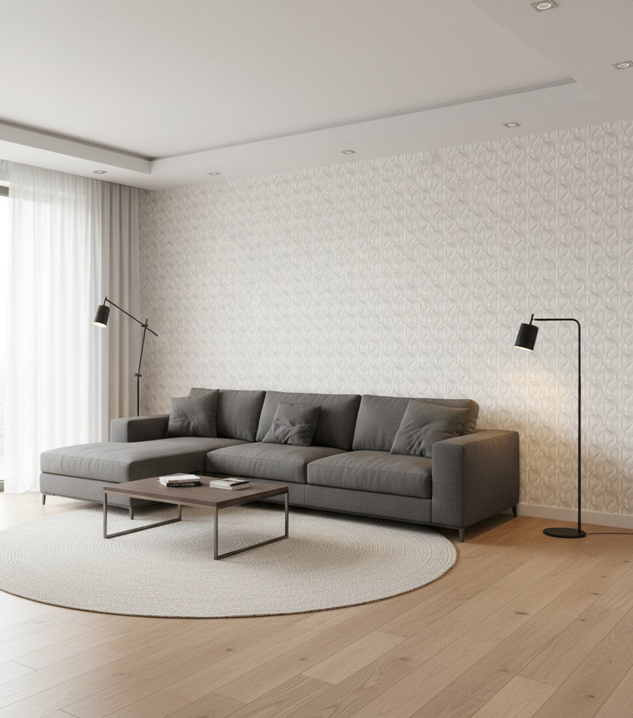 This wallcovering features a geometric pattern with a three-dimensional effect, creating a modern and sophisticated look. The neutral color palette of beige, white, and gray adds a touch of elegance and versatility, making it suitable for various interior styles.