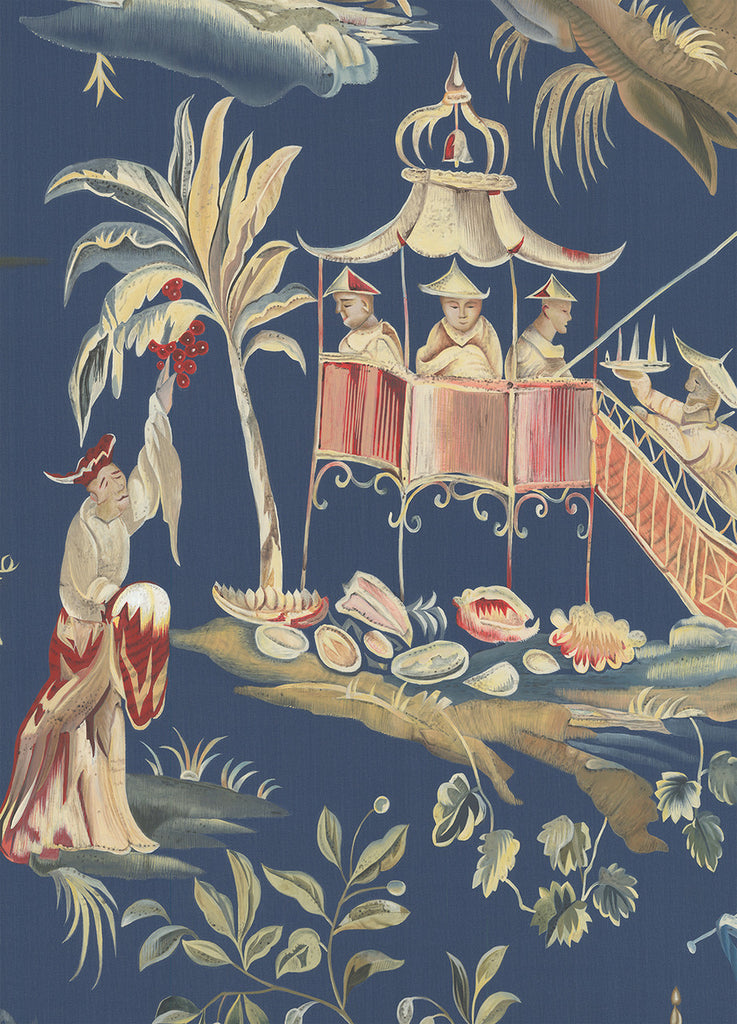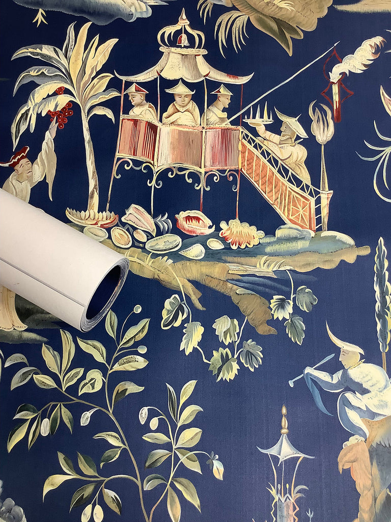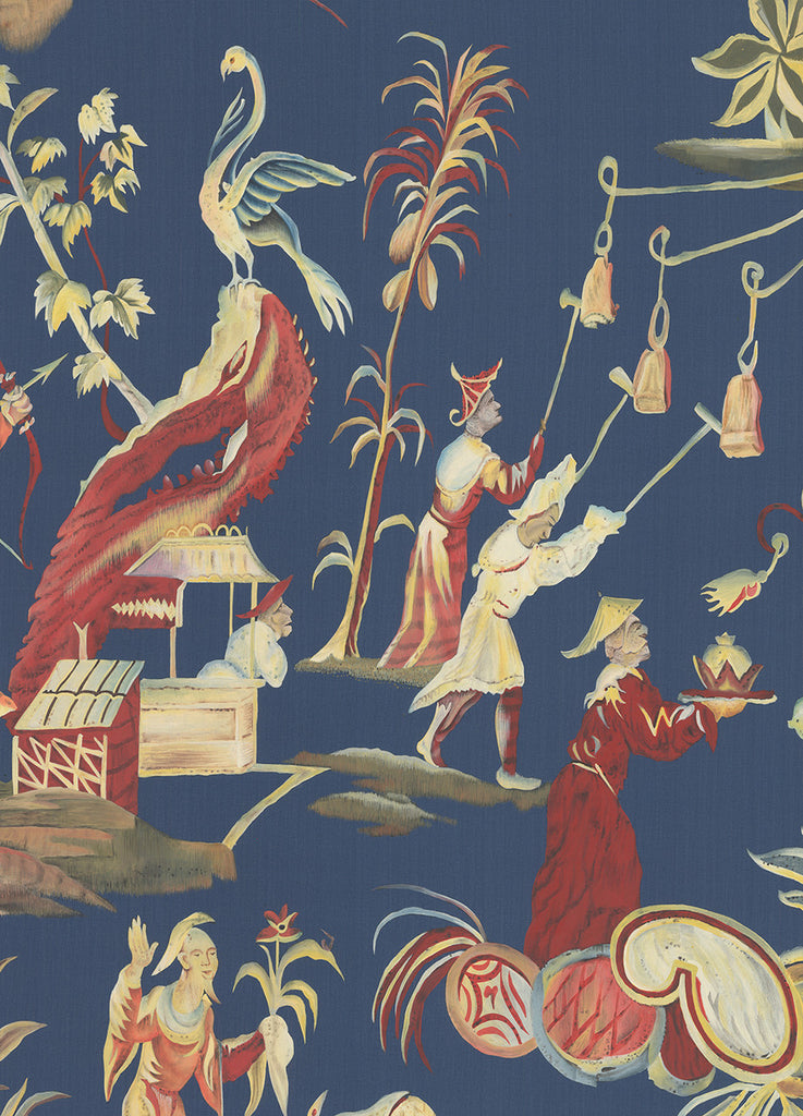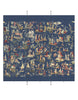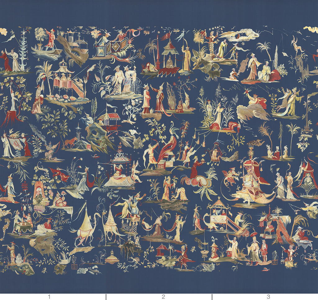 Brussels Tapestry is a mural of three separate panels hand painted on a silk blue background. Each panel consists of a collage of vignettes with figures, animals, boats, and towers. This delight of fantasy is full of unusual creatures, robed people, and wispy clouds.