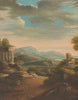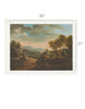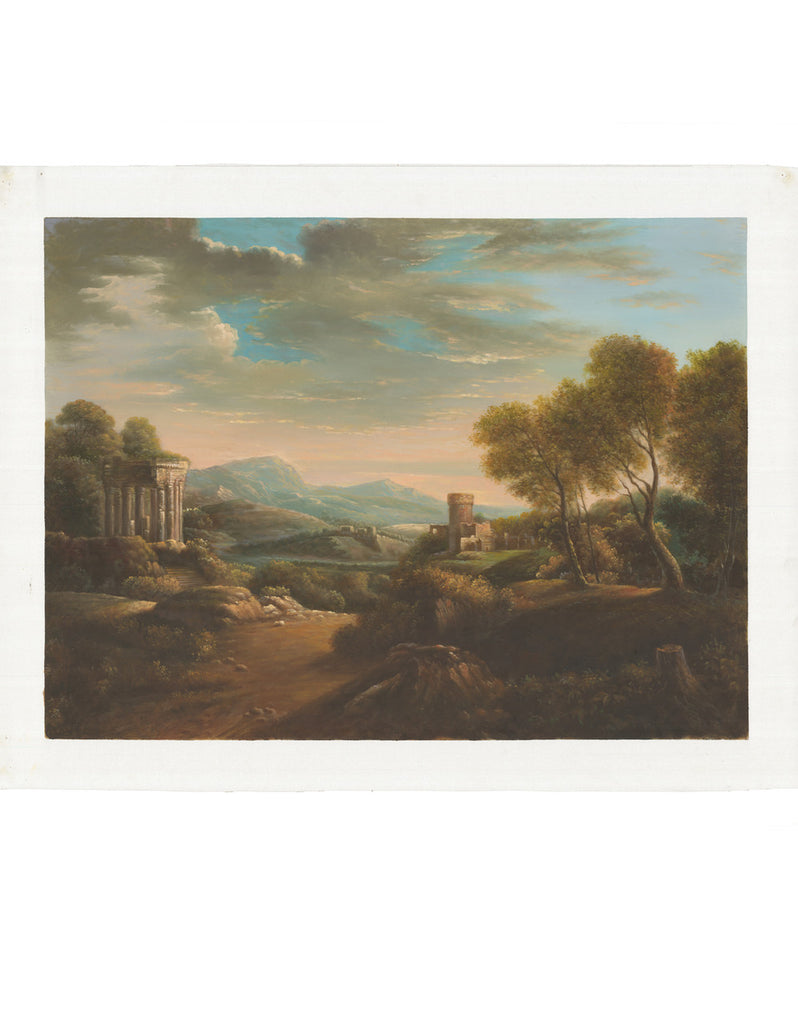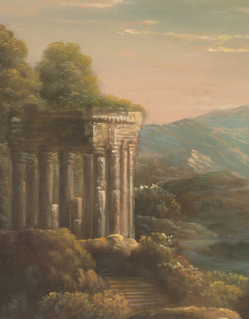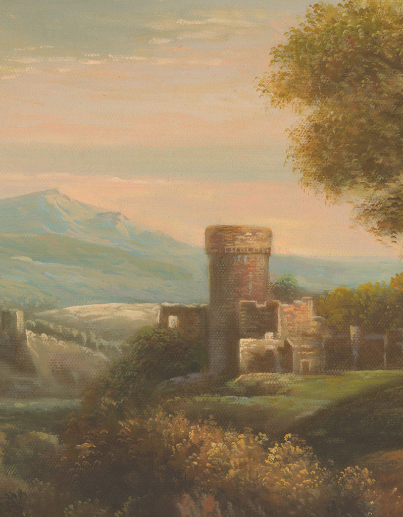 European Lanscape 2 is an original art piece hand-painted in oils on a canvas ground. The image of a glowing sunrise casts a rosy light on a scene with Roman ruins and Medeival castle. The full size of the painting is 36" wide by 27" tall. The canvas on which it it painted is larger to allow for mounting options.