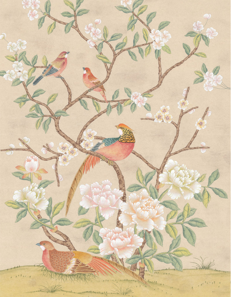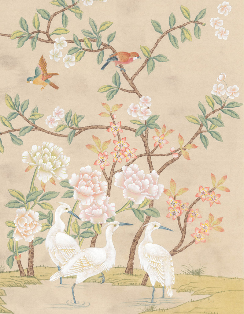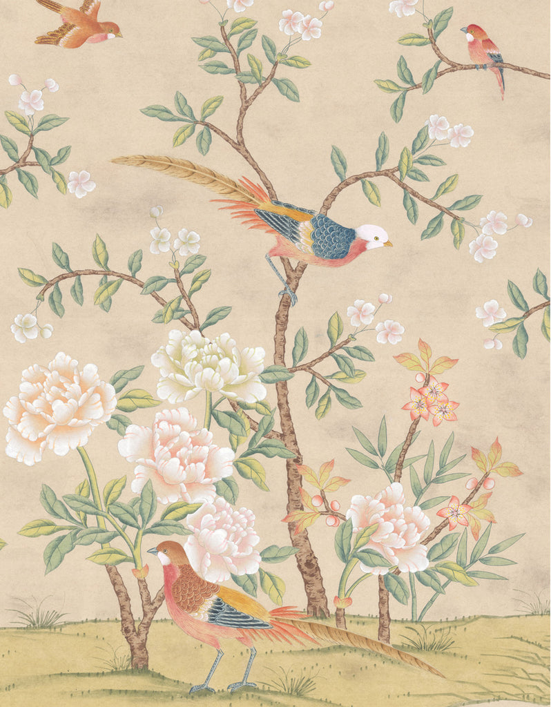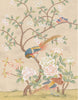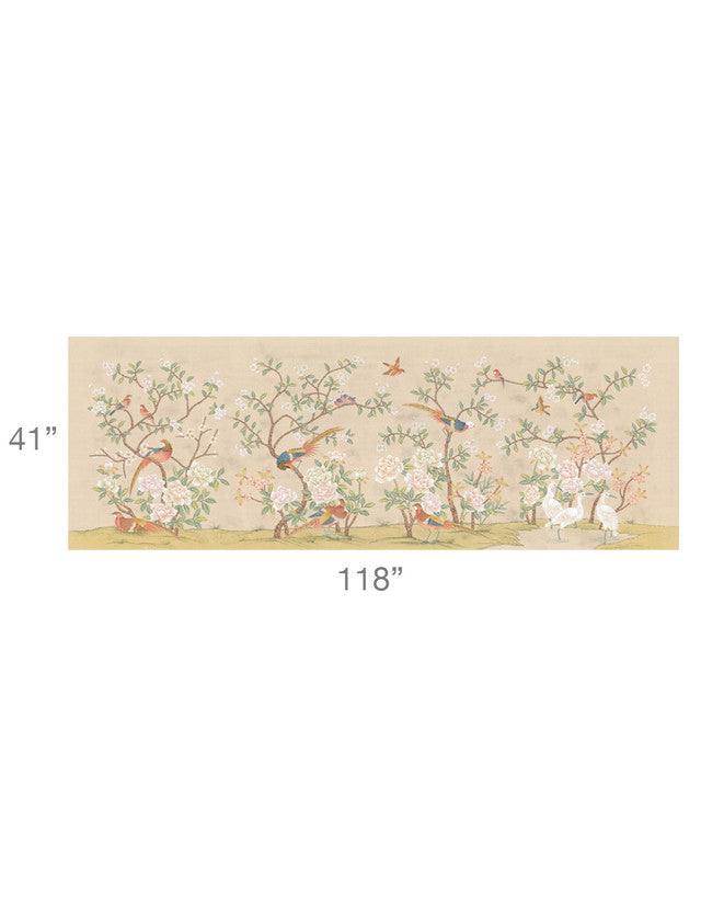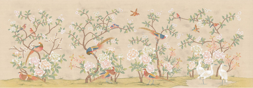 Kew Garden Landscape is a Chinoiserie design painted horizontaly on a single panel of non-woven painted paper. The panel measures 41 inches tall by 118 inches wide. Many colorful birds live in this charming scene, from tiny song birds, to pheasants to bathing cranes.