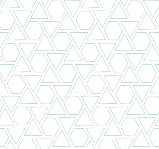 This wallcovering features a geometric pattern of triangles and hexagons in a soft light blue against a white background. Its clean and modern aesthetic makes it suitable for a variety of applications, including residential spaces and hospitality settings seeking a fresh and airy ambiance.