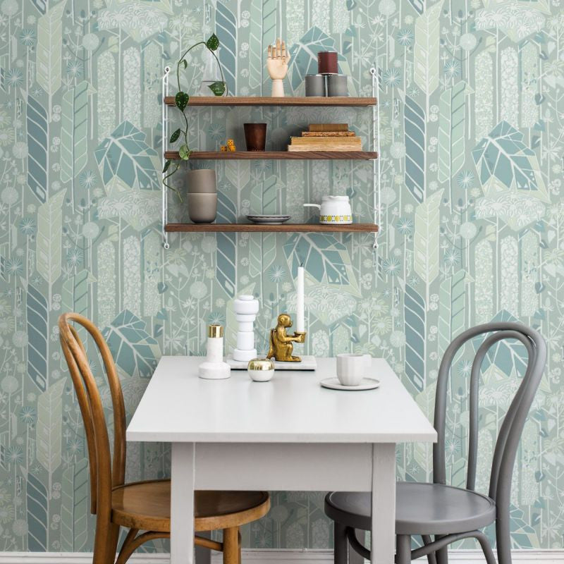 Senecio turquoise is a powerful pattern with lots of colour in well-blended shades gives the room a harmonious look. Here in wonderful turquoise which give the room a harmonious look. Design: Dagmar Lodén