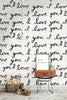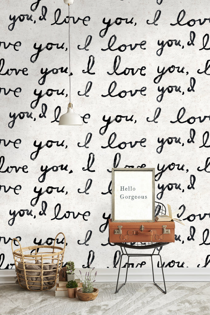 The I Love You, I Love You Wallpaper by SUGARBOO features a charming, delicate pattern combining soft handwritten script with whimsical heart motifs in subtle, neutral tones—perfect for adding warmth and romance to any space. #homedecor #designerwallpaper #interiorstyle