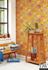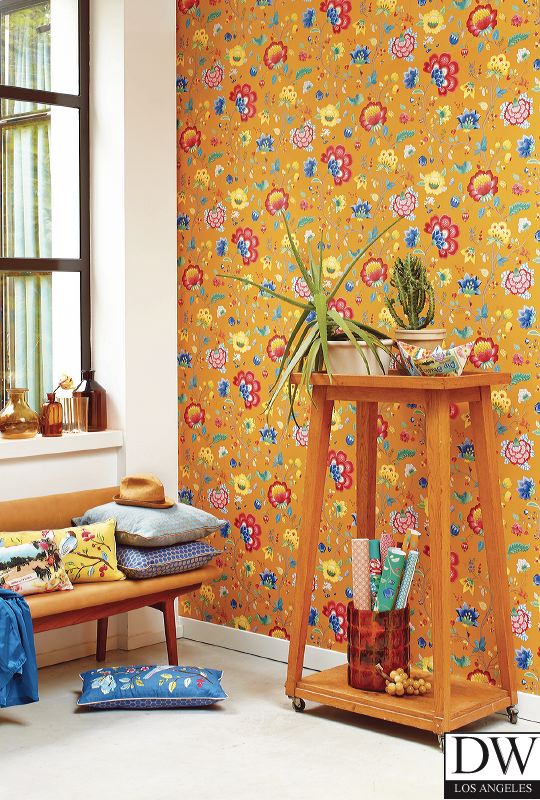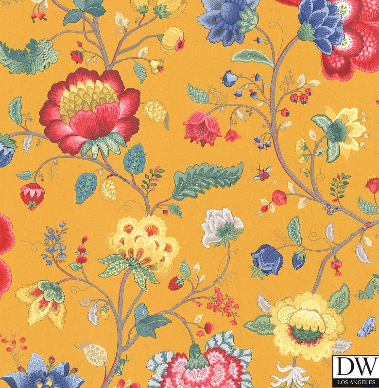 An exquisite, folk inspired floral motif where Jacobean style flowers are radiant atop a bright yellow backdrop. This playful print is truly mesmerizing on walls!