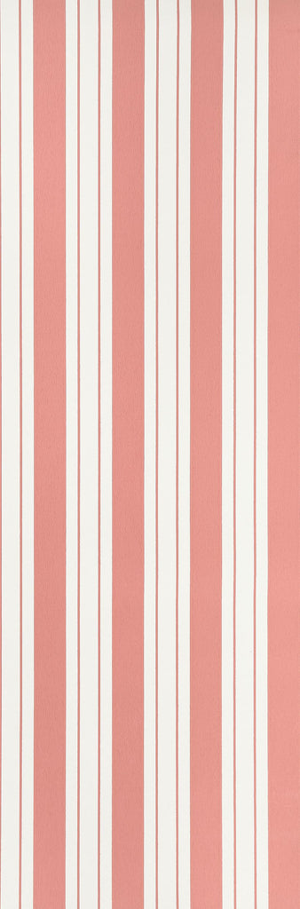 Ligorio Stripe Coral Wallpaper by Osborne & Little Europe features elegant vertical stripes in warm coral tones, creating a refined and inviting ambiance suitable for sophisticated interiors. #interiordeco #wallcoveringdesign #luxurydécor