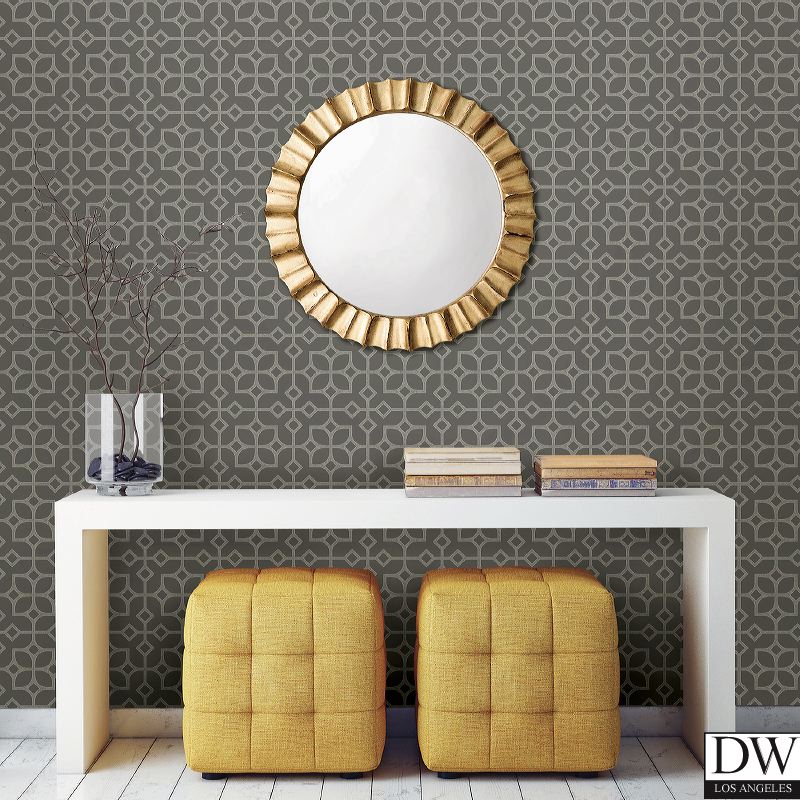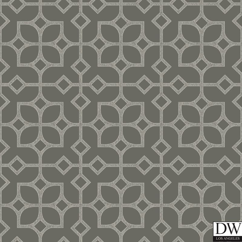 This Chinese lattice wallpaper has a cool metallic grey background and a matte surface print effect creating the tile print. The geometric design feels both modern and classic.
