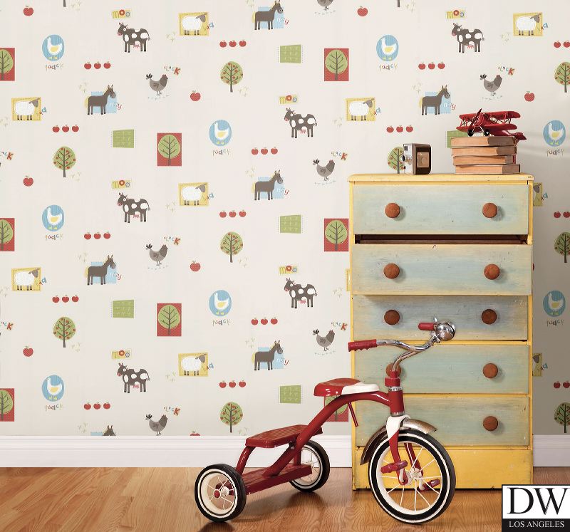 It's a happy day on the farm! This farm animal wallpaper has vintage polka dot details and a fun patchwork design.