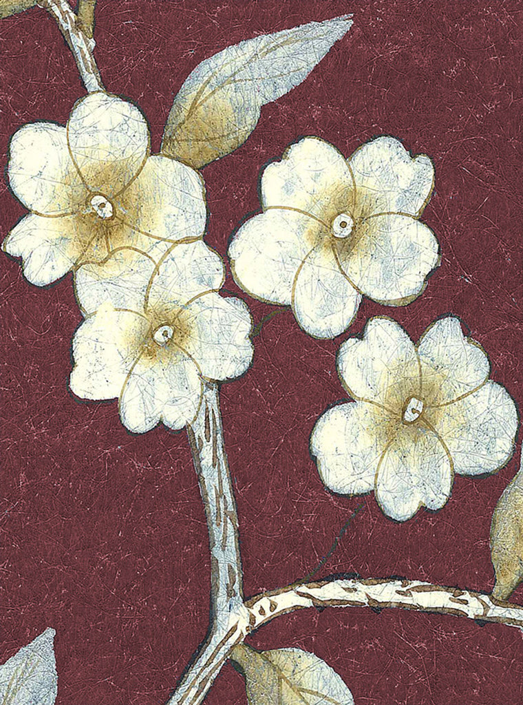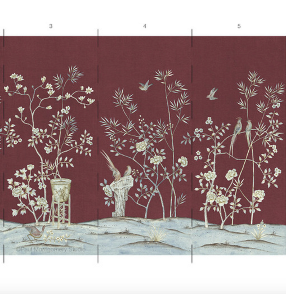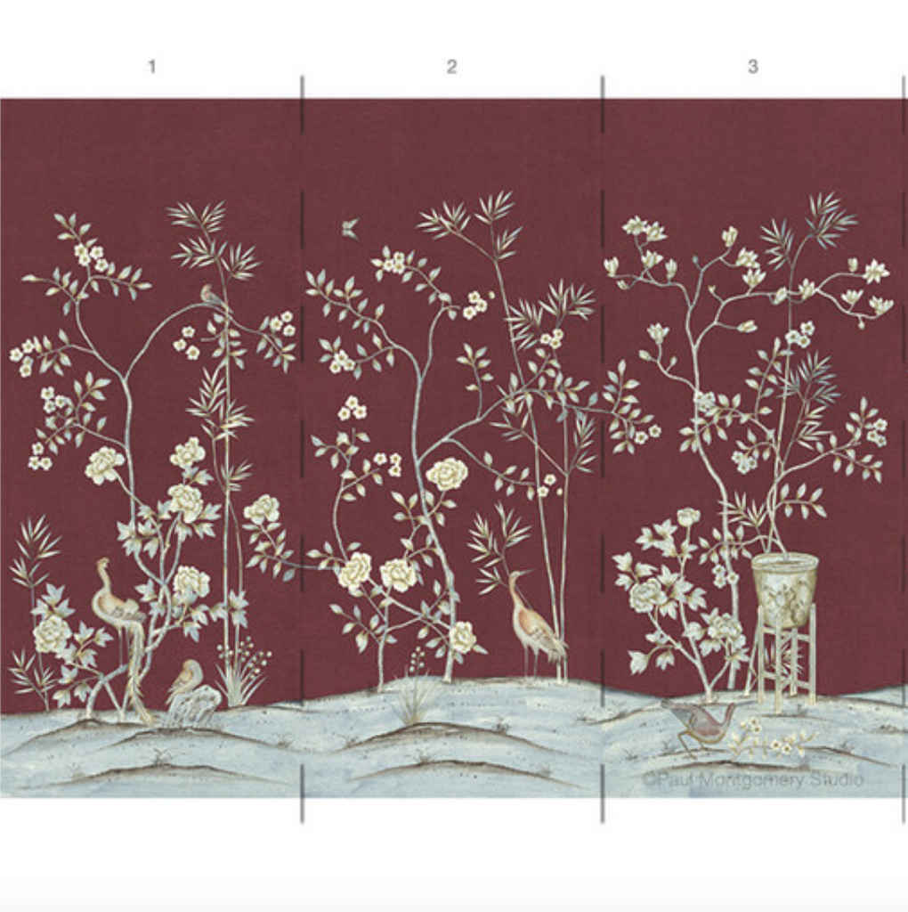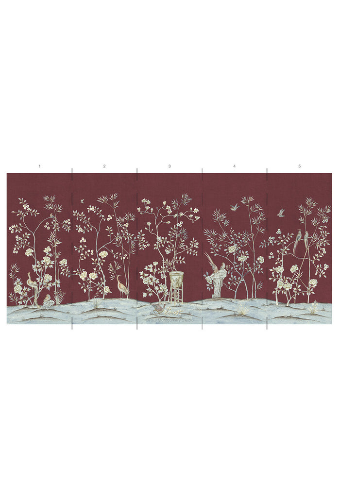 Chai Wan depicts beautiful blooms and large birds. The design has 5 panels before pattern repeats (Panel 5 matches panel 1 to repeat around a room as necessary). 5 Panels Available in Full Length/Headers/Footers, Sold in individual Panels, Width: 36", Design Height: 96", Total Height: 72", Chai Wan,Paul Montgomery Studios
