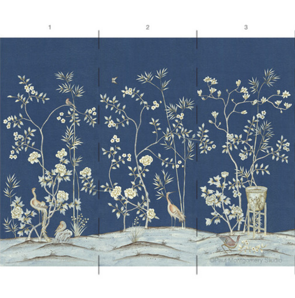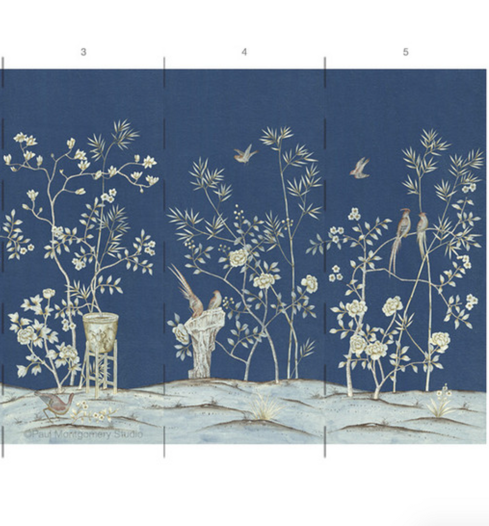 Chai Wan depicts beautiful blooms and large birds. The design has 5 panels before pattern repeats (Panel 5 matches panel 1 to repeat around a room as necessary). 5 Panels Available in Full Length/Headers/Footers, Sold in individual Panels, Width: 36", Design Height: 96", Total Height: 72", Chai Wan,Paul Montgomery Studios