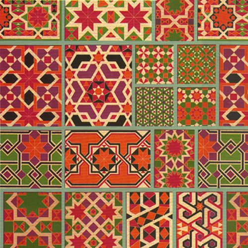 This red and green Moroccan faux fabric wallcovering features a complex geometric pattern, adding a touch of exotic elegance to any space. Its durable vinyl construction makes it ideal for high-traffic commercial environments, offering both style and practicality.