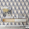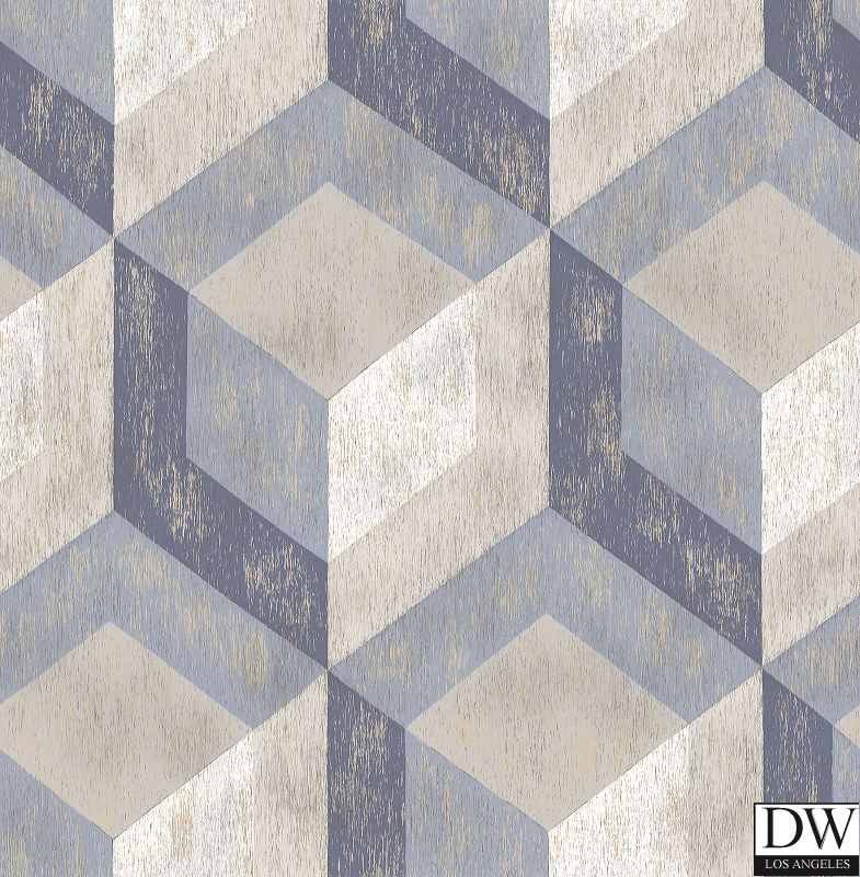 This wood wallpaper is a mixture of midcentury modern shapes and contemporary colors. The nautical inspired design has a distressed appearance with weathered paint and imperfect wood. The background pops with shimmering accents.